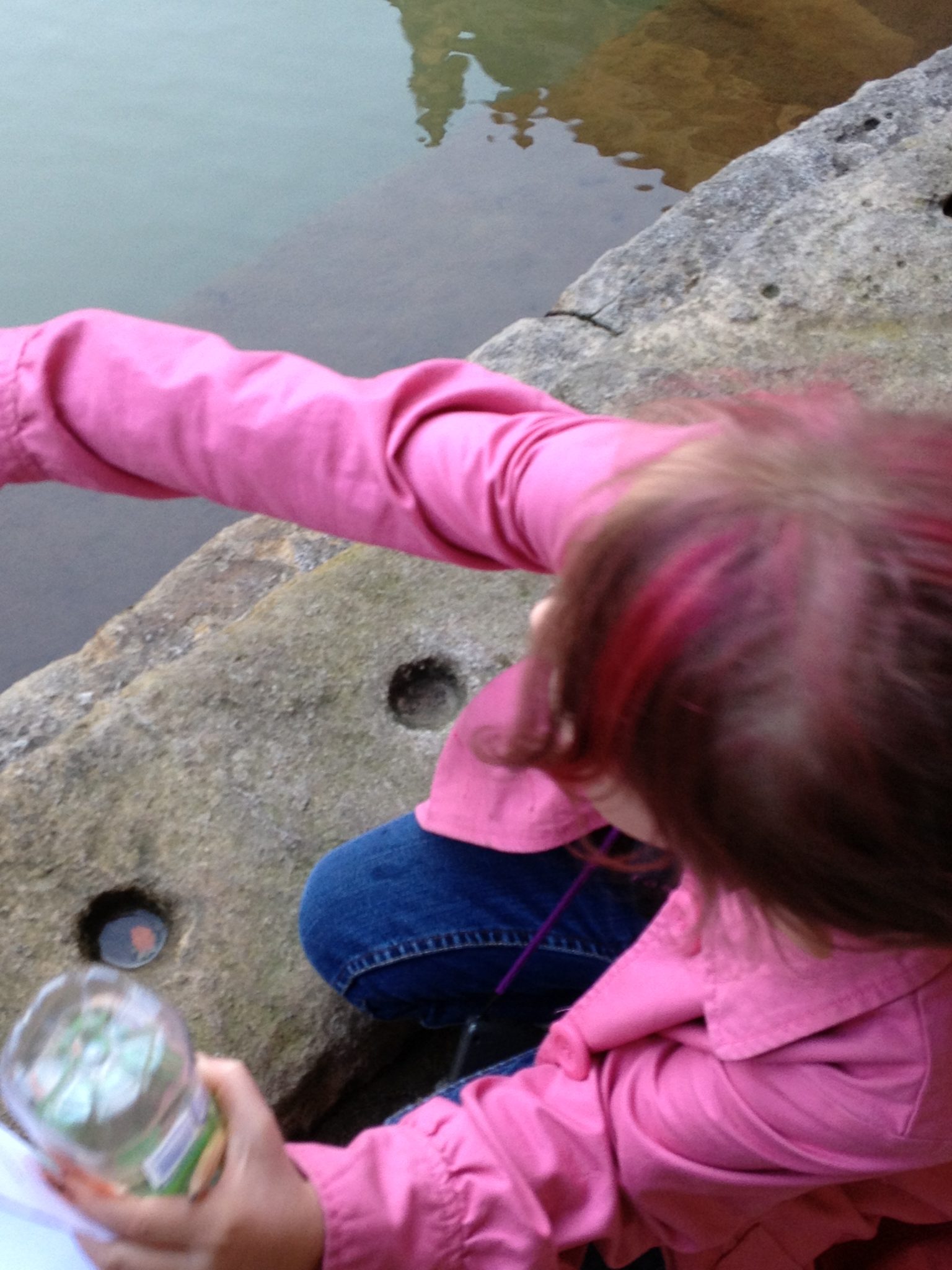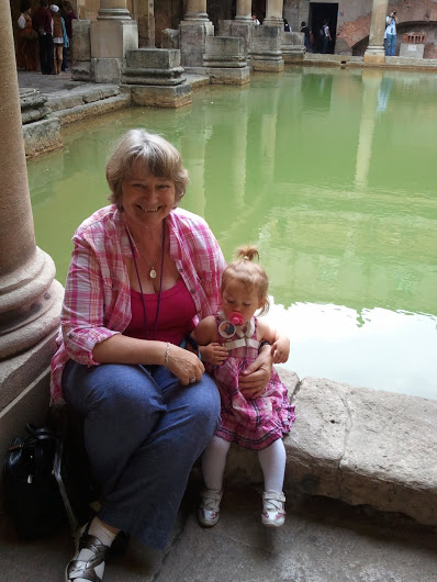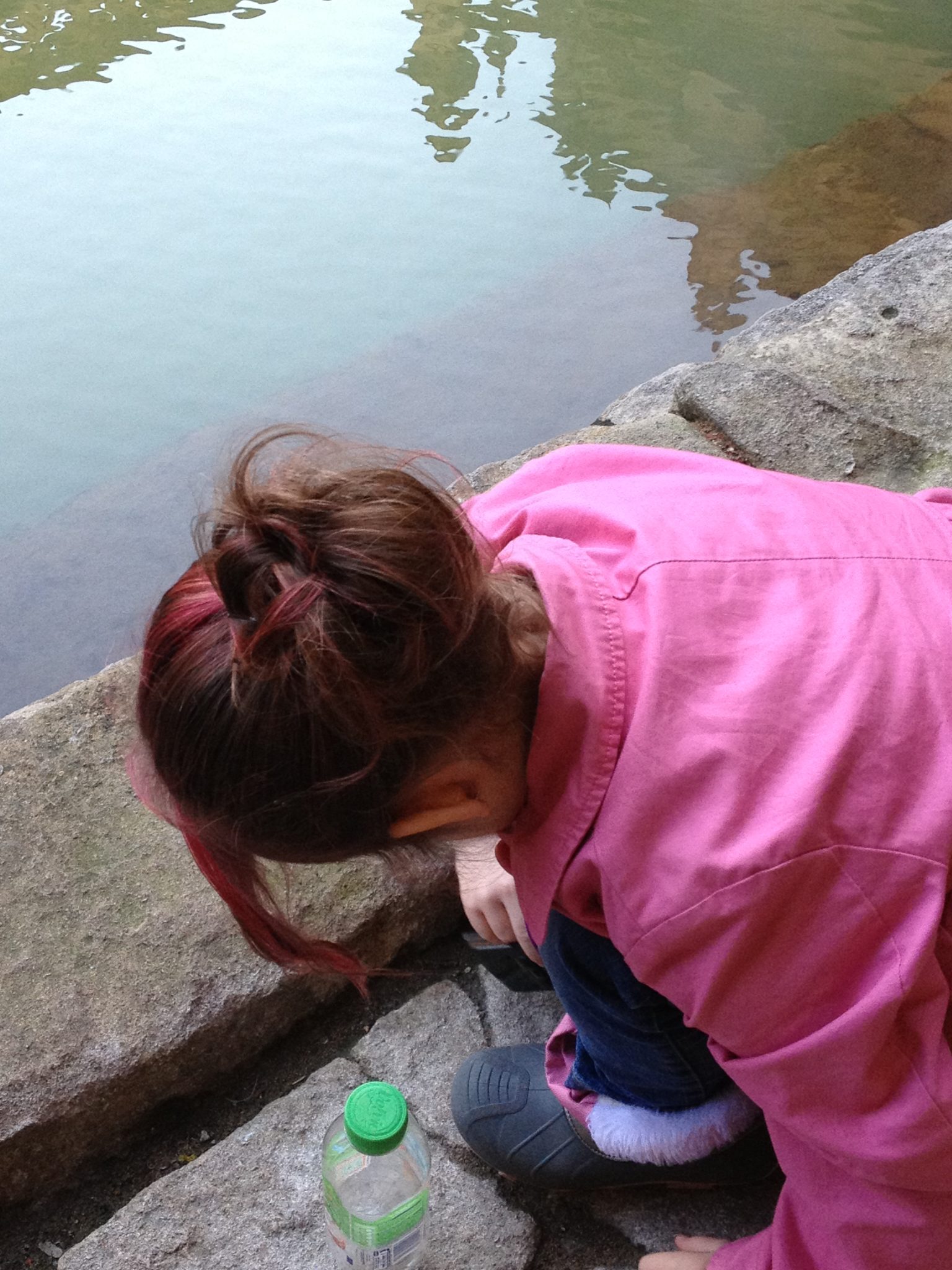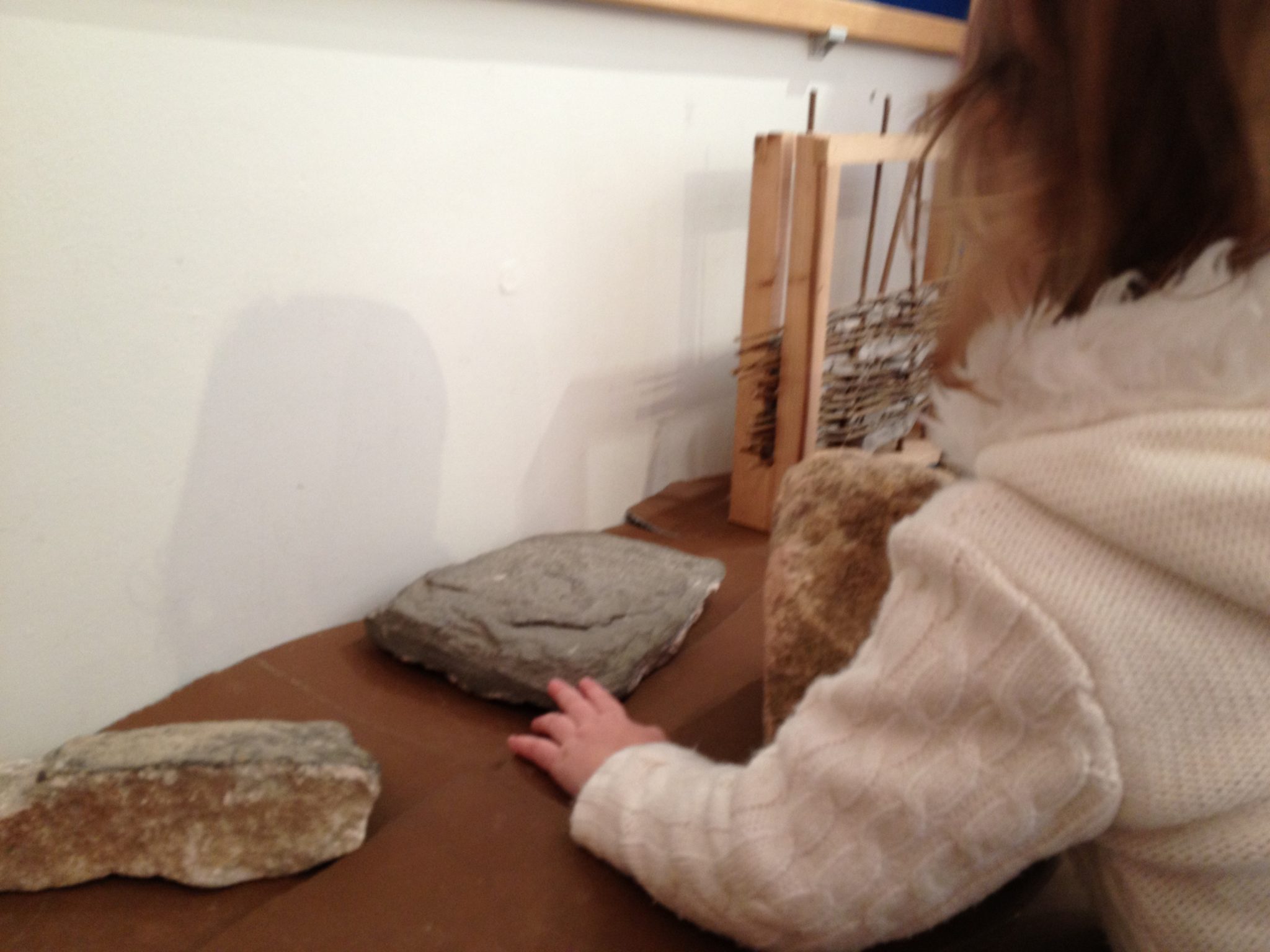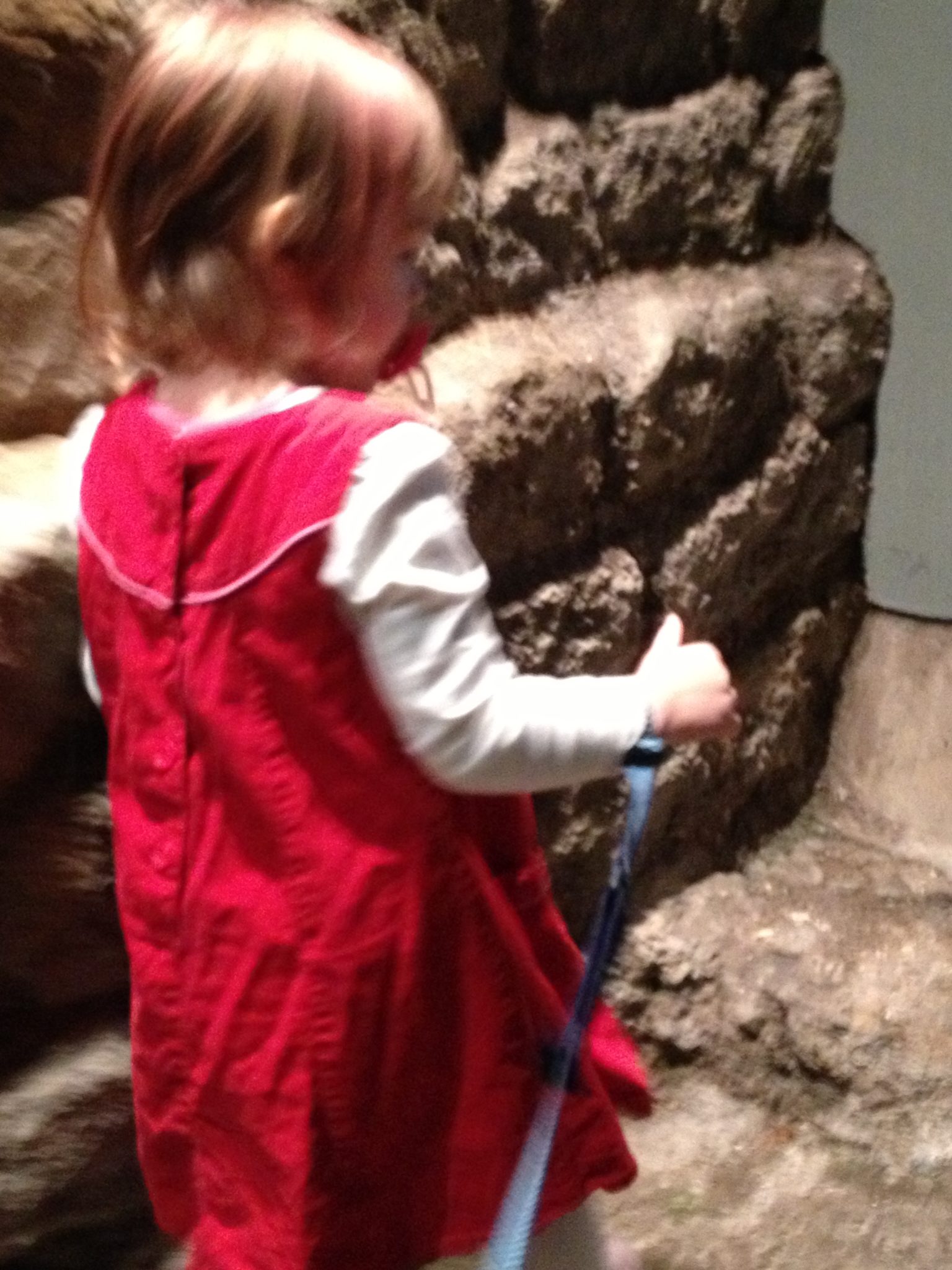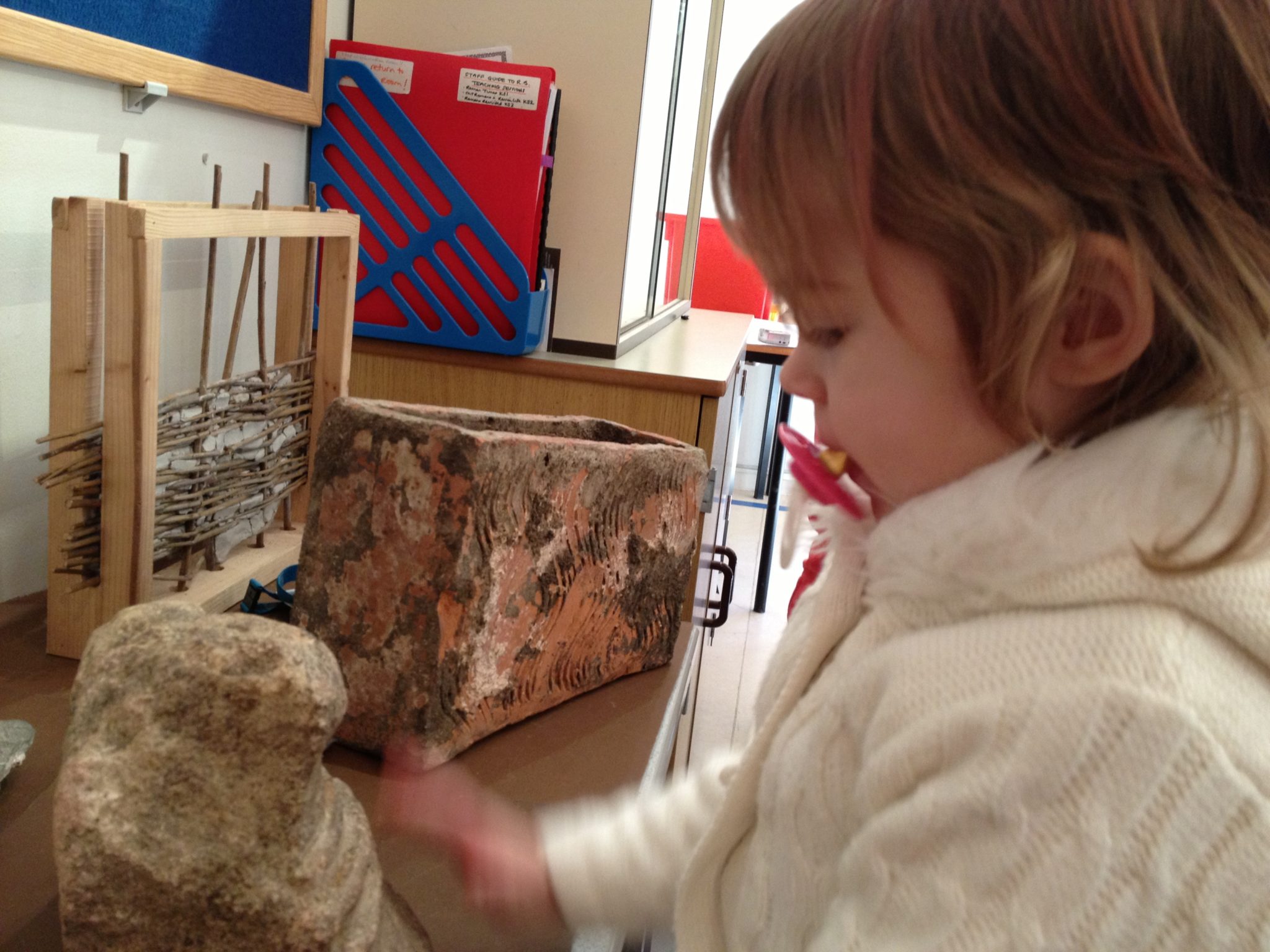 While the Children were listening to the Lady from the Roman Baths talk about the all the pieces she was passing around the group Emily who had not long woken from a short nap started to investigate the Rocks behind where we were sat all of the sort used around the site. she really seemed to like the larger stone with lines on it as she was happily stroking the rock and seemed completely amazed that it was so soft.