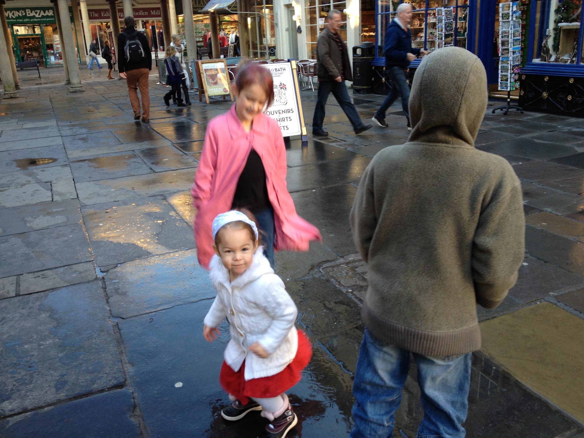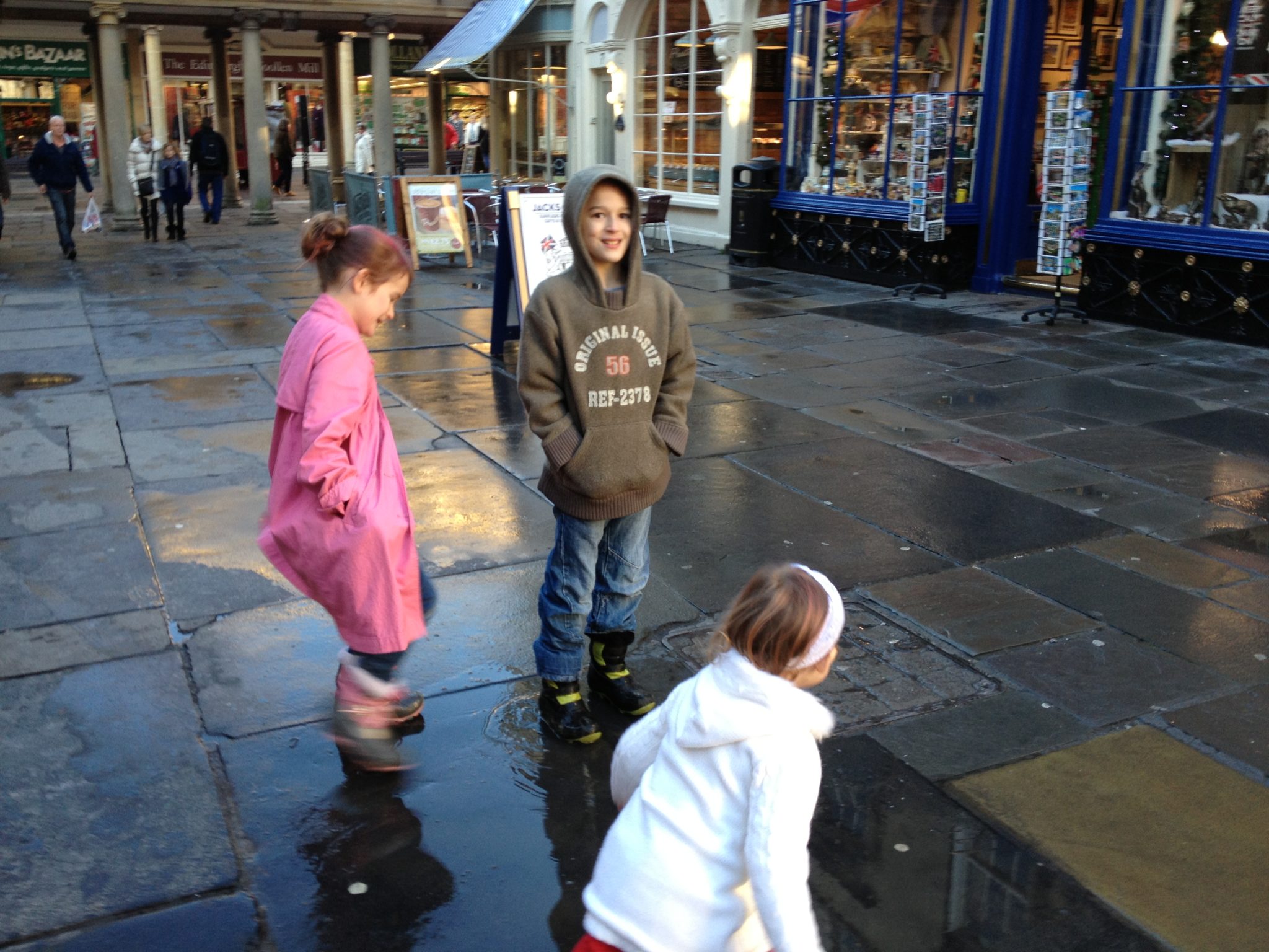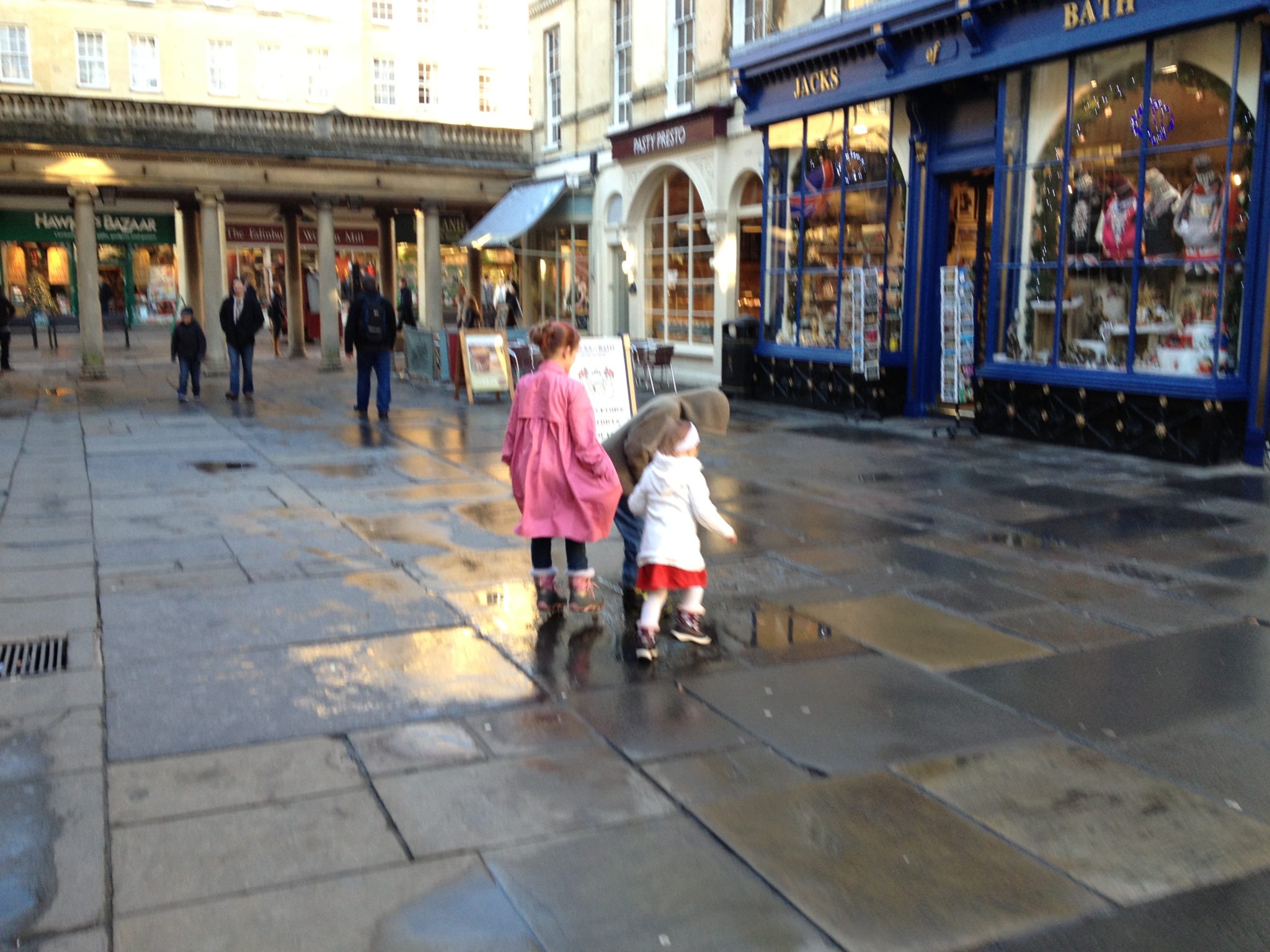 Puddle Jumping in the puddles around the front of the entrance to the Roman Baths waiting for the lady who organised the trip and the other Home Educators to show up and to go in and have some Roman fun.