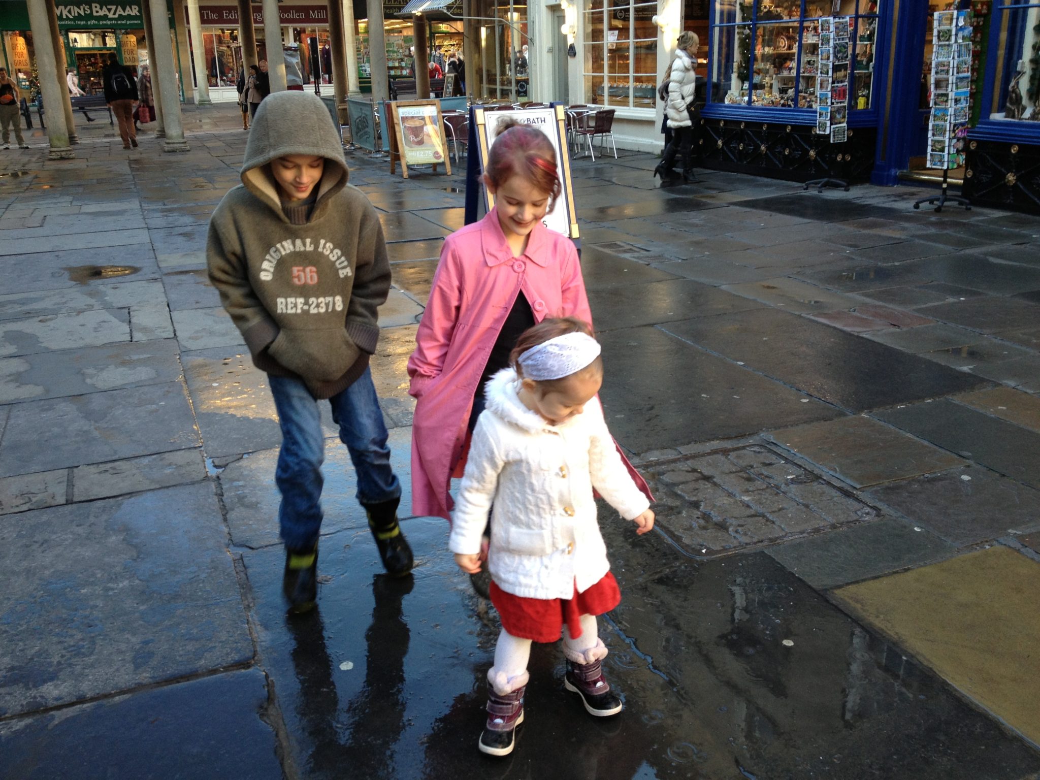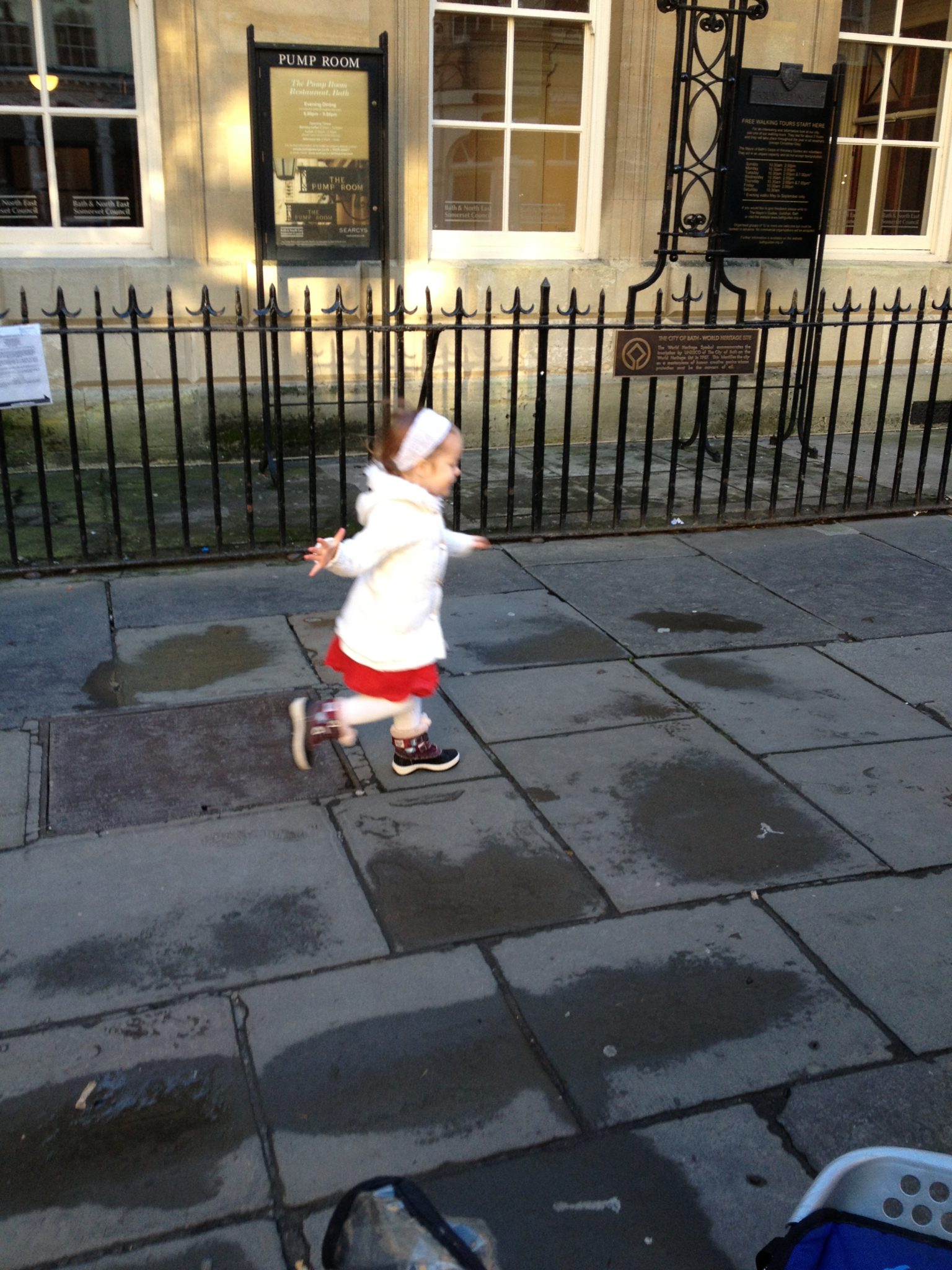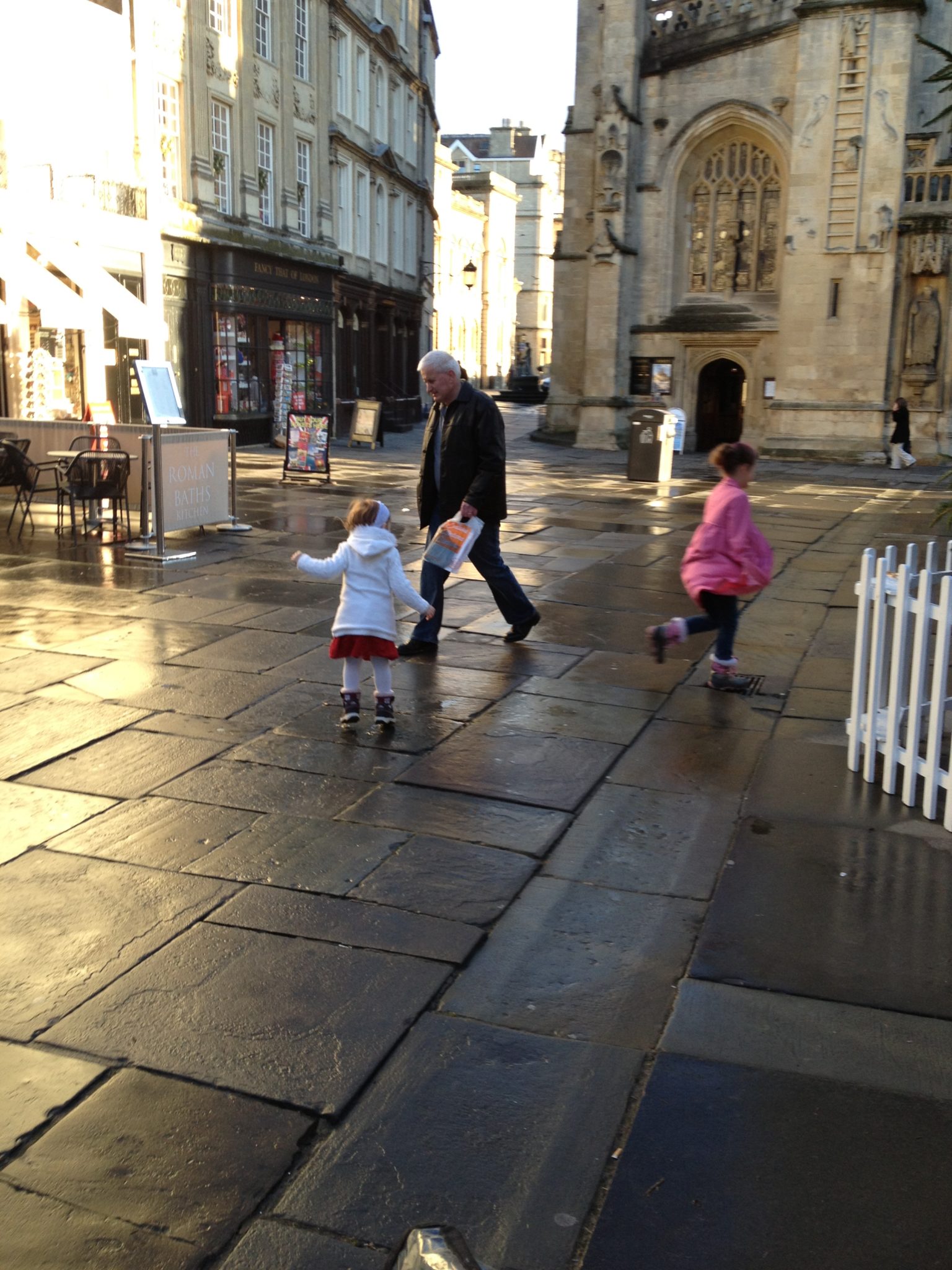 Puddle Jumping in the puddles around the front of the entrance to the Roman Baths waiting for the lady who organised the trip and the other Home Educators to show up and to go in and have some Roman fun.