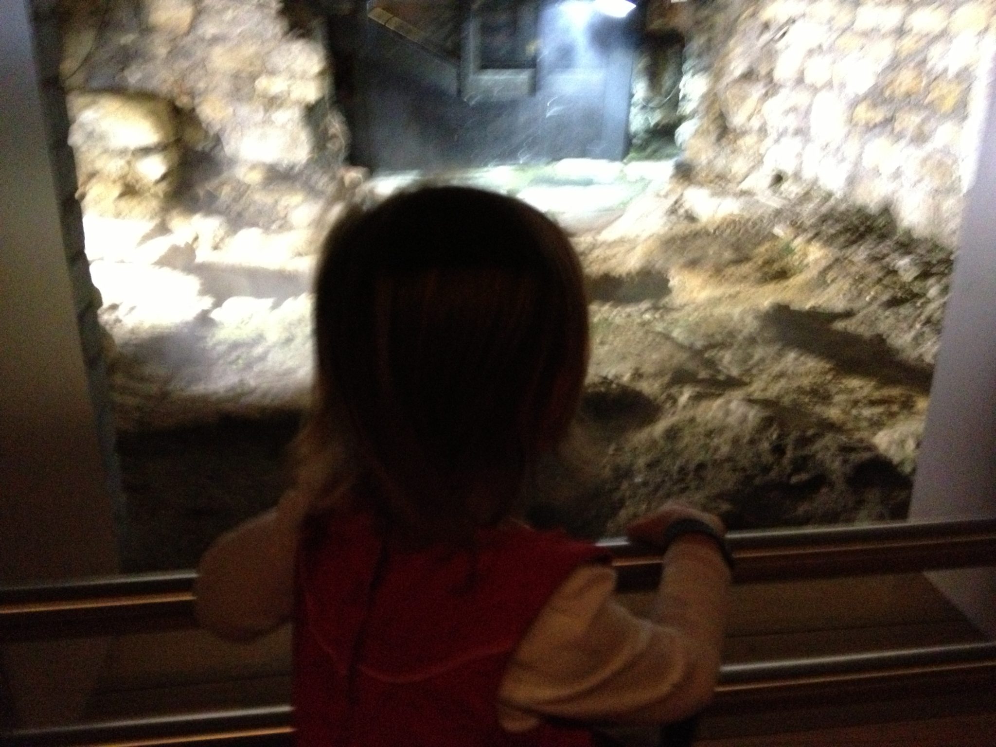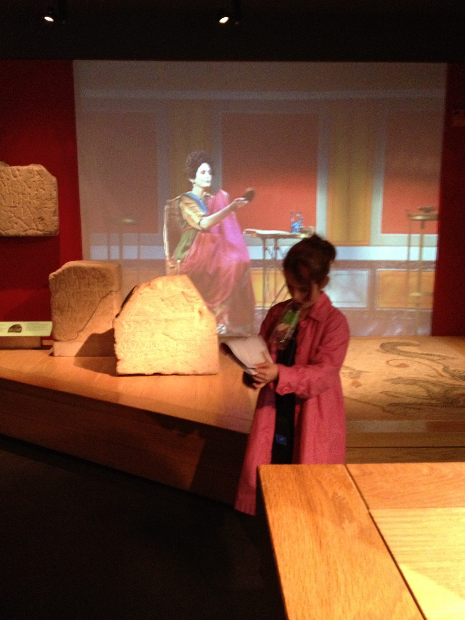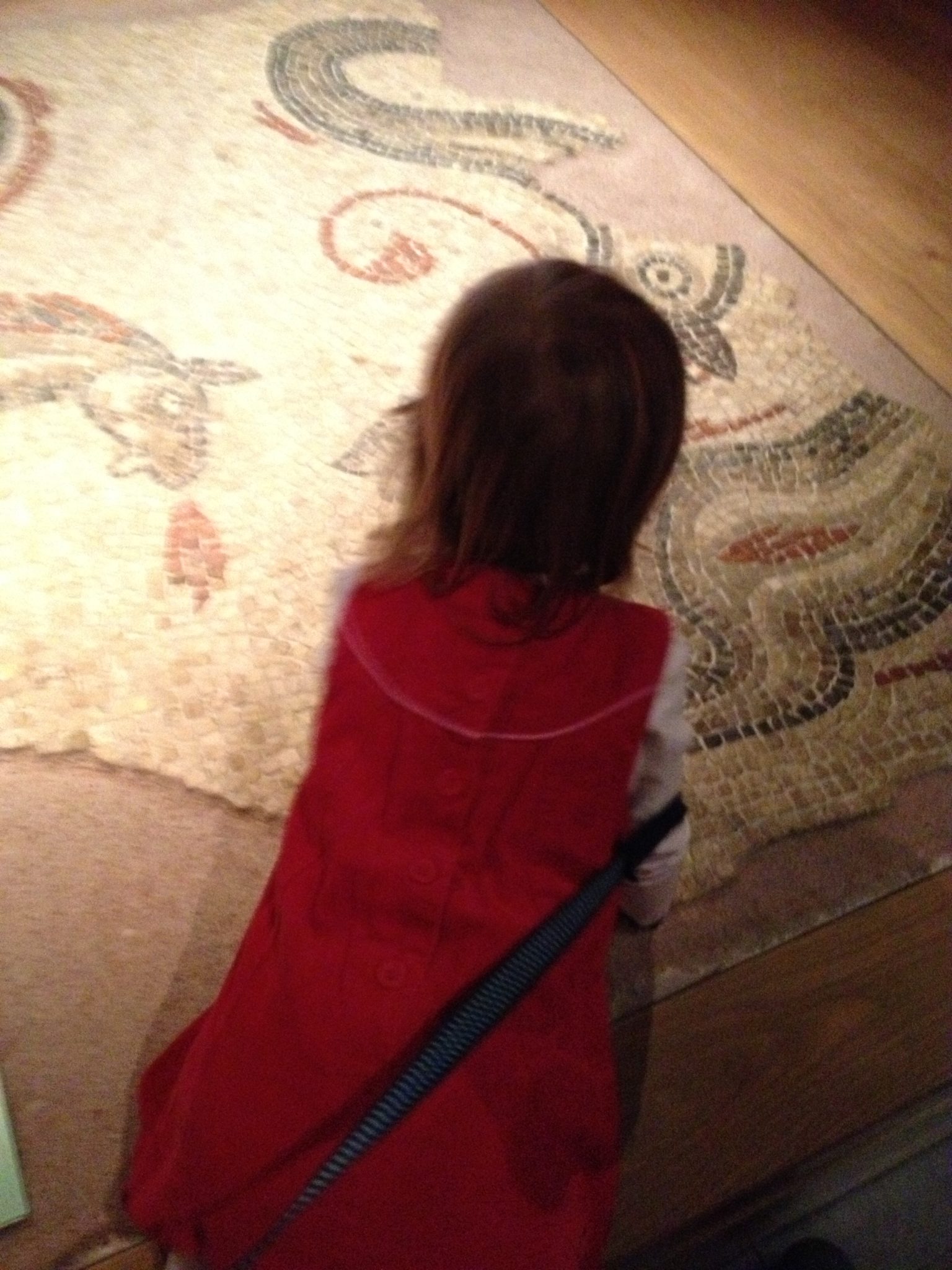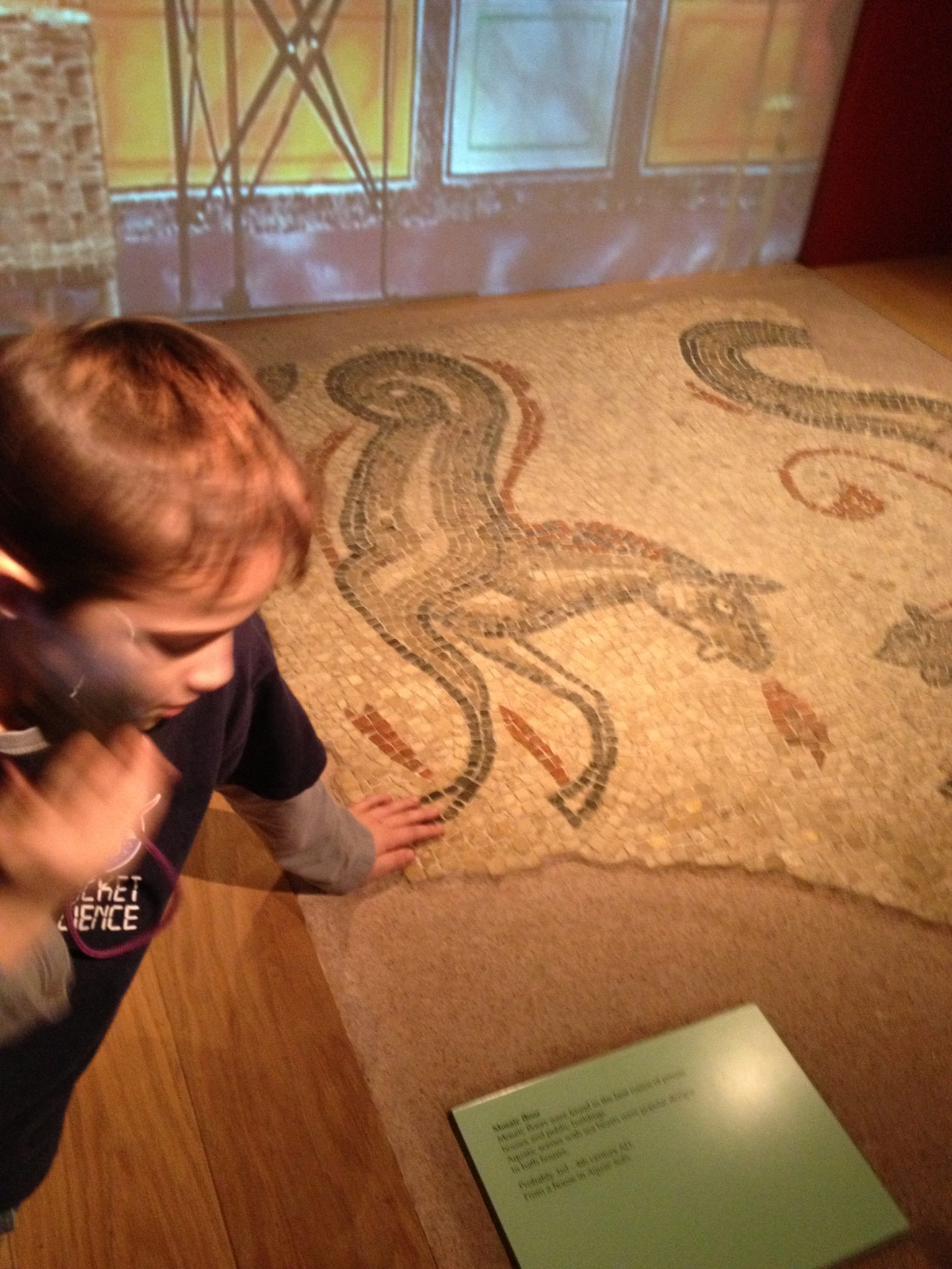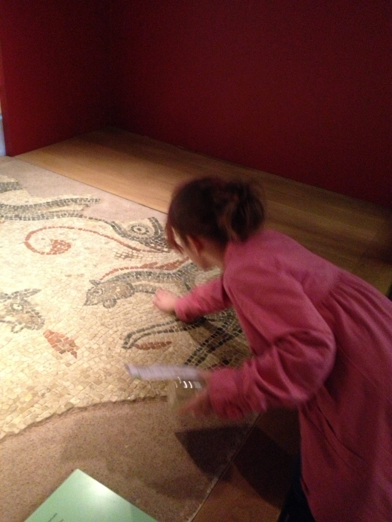 then you come to the only real interactive part of the Museum where the children really enjoyed being able to touch a mosaic’s and Emily even laid down talking to the animals on it,