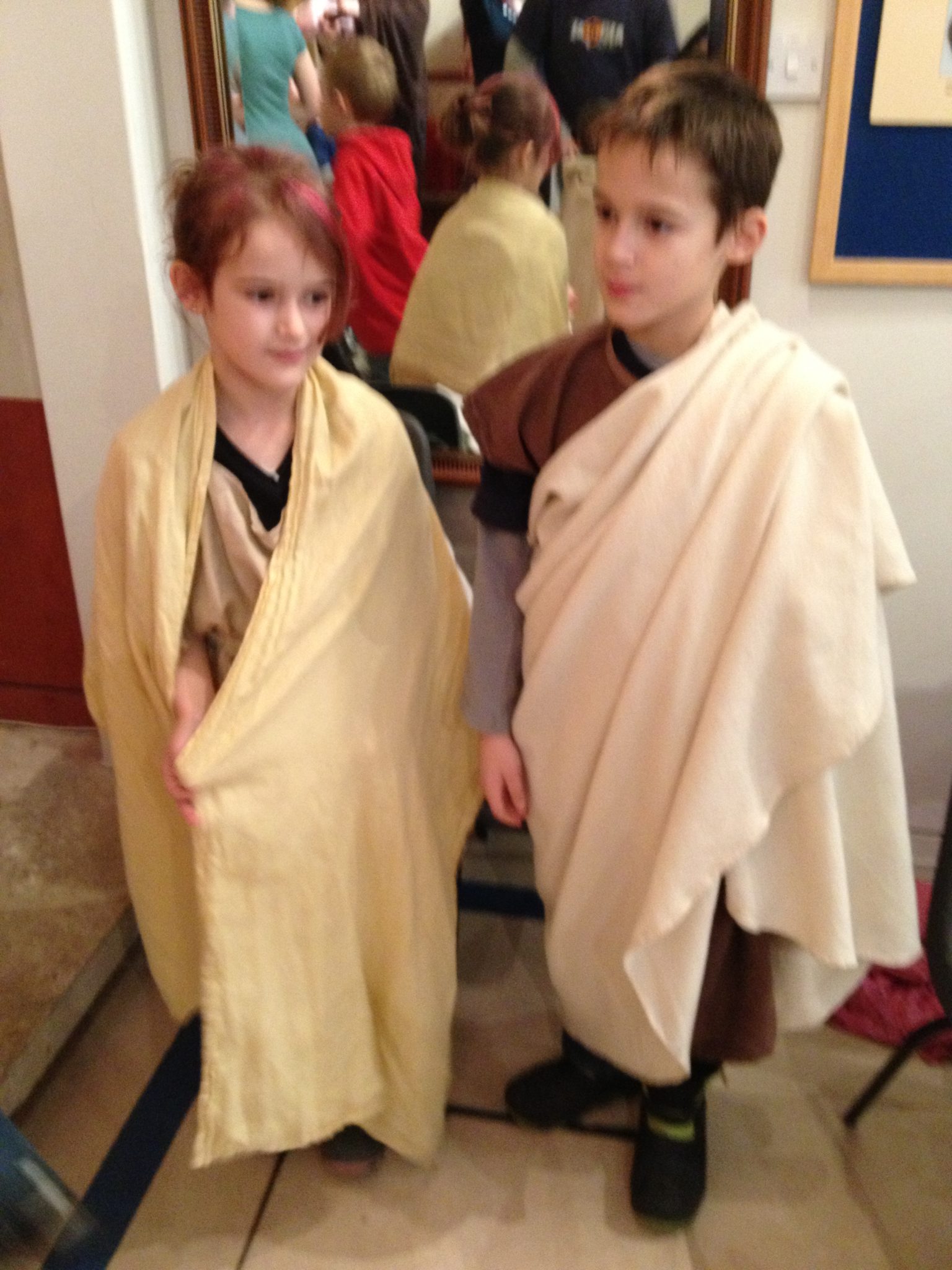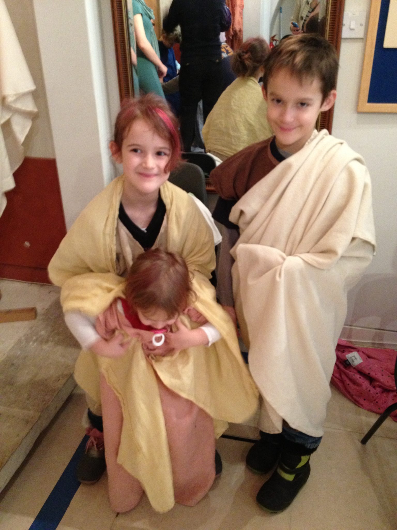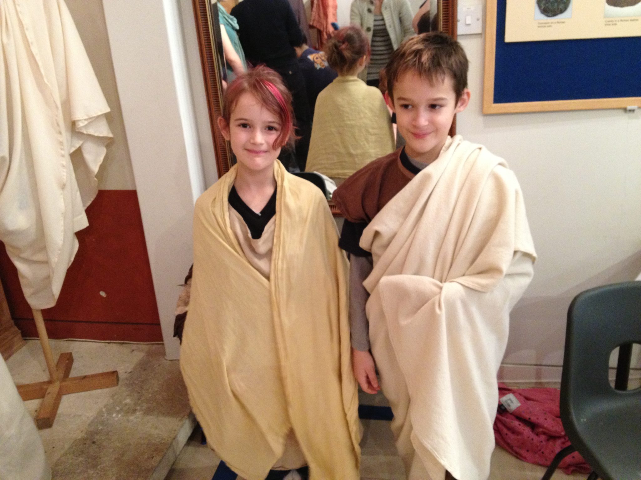 After the Mosaics they were talked through the types of clothes the Romans wore and who wore what before letting them all dress up Jessica is wearing a Tunic and Stola Thomas is Wearing a Tunic and Toga both Tunics are belted in the middle.