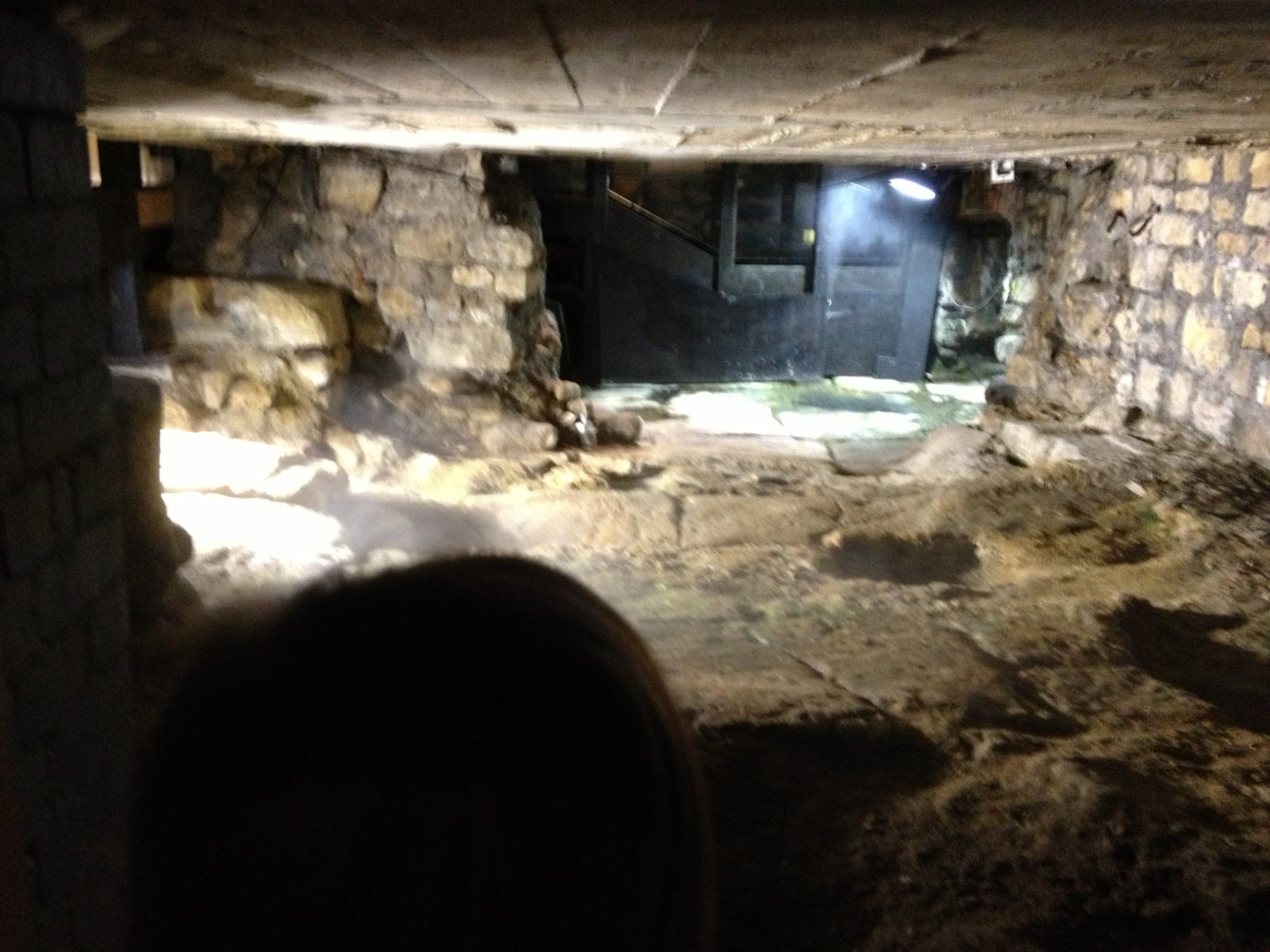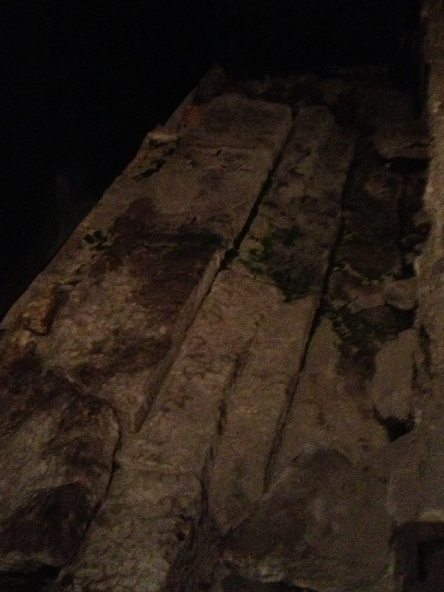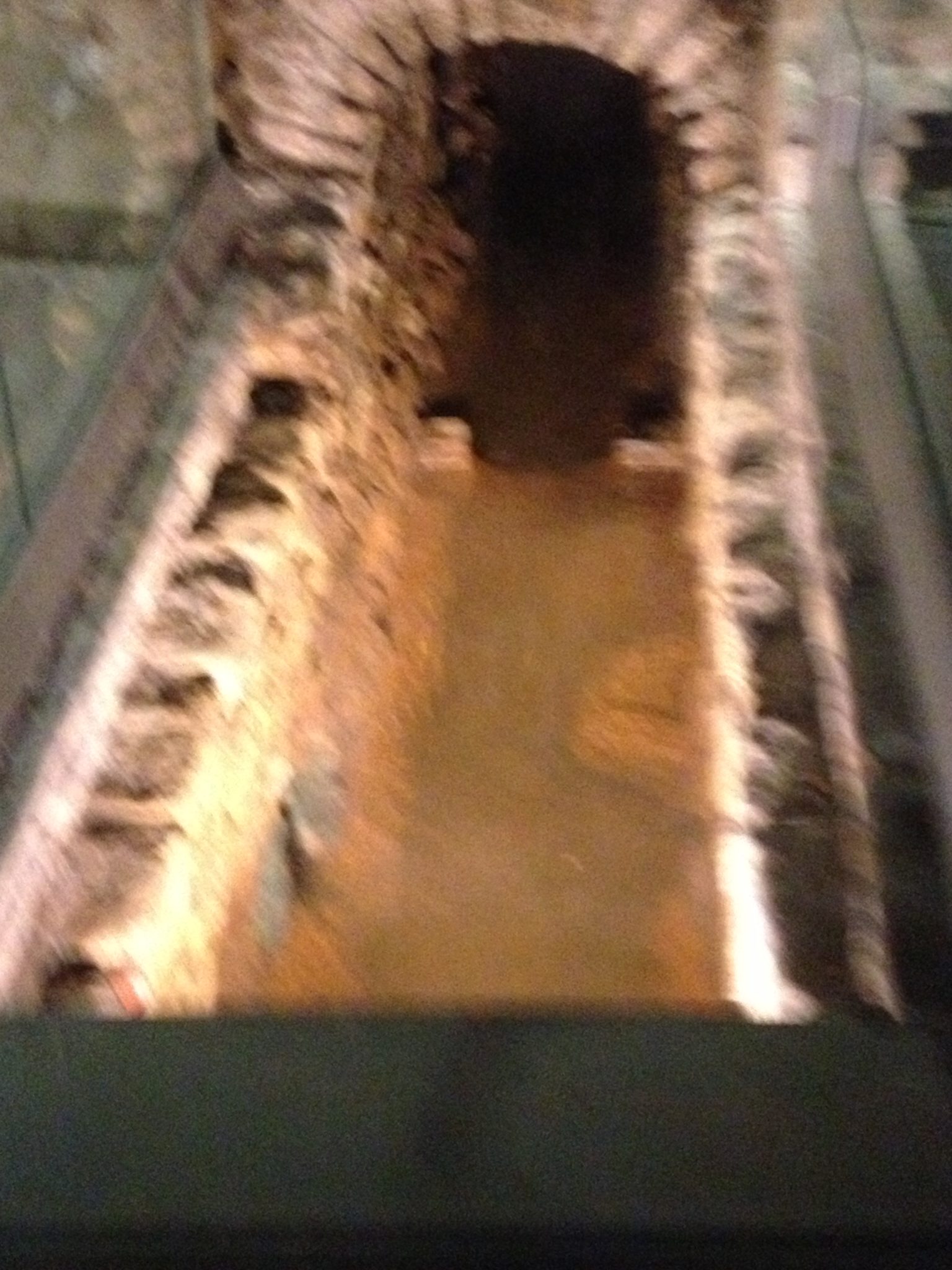 As you walk around if you notice there is a short thin passage that widens out and if you lean down and get on your hands and knees you can see what the right hand picture depicts and in the back you can see the other side of the Sacred Springs Overflow. Now I am a little confused as to what part of the Baths it is I think it is part of the Temple Court yard.