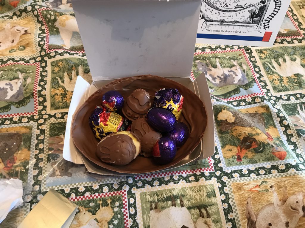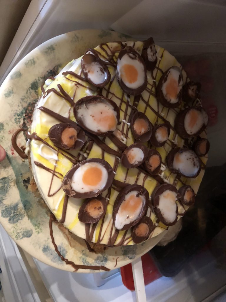 Finished product (we borrowed some two of the large eggs wrappers to cover two of them ???? the smaller ones in picture are actually mini creme eggs) then we set about making daddies birthday cake which was a creme egg cheesecake (made with actual creme eggs and not our homemade ones)