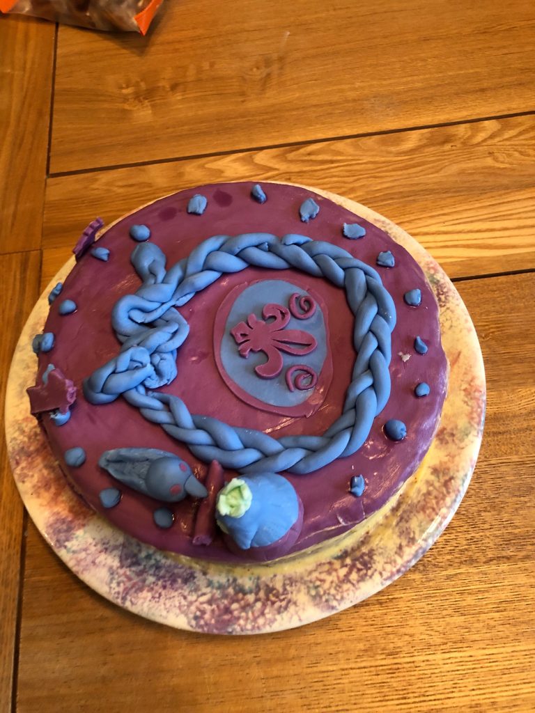 This was the finished big cake we had hoped to take pictures once it was cut as it was a rainbow cake but unfortunately our fat dog poppy in typical beagle manner cant be trusted around food and i took my eyes off the ball (or in this case the cake) and while i was welcoming nana and grandad she was up on the table and scoffing it down!